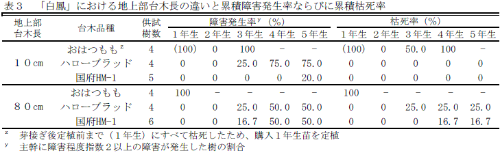 「おはつもも」、「ハローブラッド」、「国府HM-1」を台木として、地上部台木長を慣行の10cmより長い80cmとしても、主幹部障害、枯死樹の発生を抑制する効果は認められない(表3)。 |