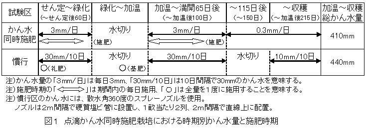 かん水量は、せん定後から60日間と加温開始から100日間は毎日3mm、以降、収穫までは毎日0.3mmとする(図1)。 |