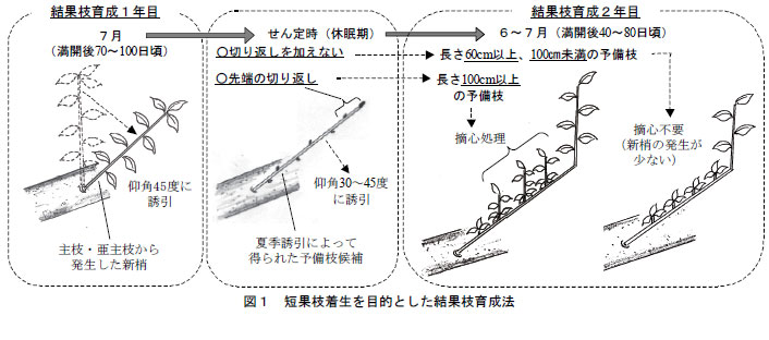 ニホンナシ「あきづき」において短果枝の着生した結果枝を育成するには、主枝・亜主枝から発生した新梢を7月に夏季誘引して予備枝候補とし、翌年、100cm以上の予備枝には切り返しを加えて誘引し6~7月に摘心処理を行い結果枝を育成する。60cm以上、100cm未満の予備枝は切り返しを加えずそのまま誘引し結果枝を育成する。 | ||||||||||||||