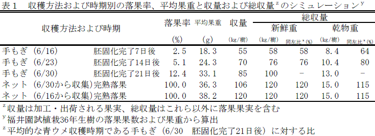 ネット収穫は手もぎ(青ウメ)より果重が増加するために収量(加工利用向け果実)、総収量(収穫されない果実を含む)ともに増加する。平均的な青ウメ収穫(胚固化完了21日後手もぎ 100kg/樹)と比較すると、ネット収穫の総収量は新鮮重では21%程度の増加であり、完熟果実ほど果実の水分が増加するために乾物重では、やや少ない15%程度の負担増になる(表1)。 |