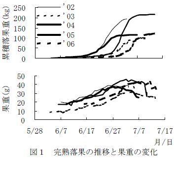 ウメ「紅サシ」の完熟落果の累積果重は単一S字型曲線を示す(図1)。落果果実は落果時期が遅いほど大きい。ただし、落果終期は発育が遅く、生長が劣る樹冠内部の果実が落果の中心となるために小玉になる(図1)。一樹内では大玉果ほど早く落果する傾向がある(データ省略)。 |