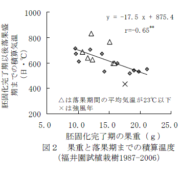 胚固化完了期の果重と胚固化完了から落果盛期(落果率50%)までの積算温度には相関が認められ(Y=-17.5X+875.4 X:胚固化完了期の果重 Y:固化完了期から落果盛期までの日平均気温の積算値)、胚固化完了期の果重が大きいほど落果期は早まる。ただし、低温年は予測値より遅れることがあり、強風は落果を早める(図2)。 |