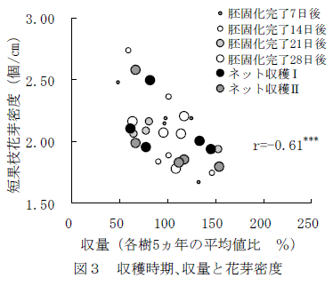収穫時期や収穫方法に関わらず収量が多いと、樹体への影響として花芽の着生が悪くなる(図3)。 |