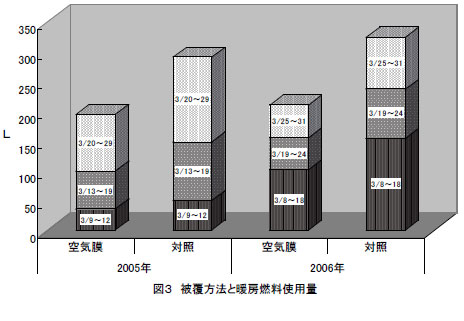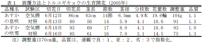 パイプハウスへフィルムを2枚重ねて展帳し、その間に空気を送り被覆の複層化を図る空気膜ハウスは、冬季の暖房燃料使用量を30%削減することが可能である。また、1月定植・6月開花のトルコギキョウの生育及び切り花品質への影響は、認められない。 | ||||||||||