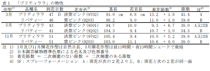 高温期に開花遅延及び花弁の退色が起こるため、10月から6月の開花作型が適する。 |