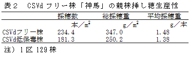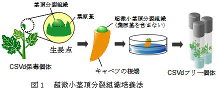葉原基を含まない茎頂分裂組織をキャベツの根端部へ置床し、培養する超微小茎頂分裂組織培養法により、ウイロイドフリー株が作出できる。作出されたウイロイドフリーの「神馬」は産地で栽培されている株に比べ、草丈が高くなり、切り花重が増加する。 | ||||||
