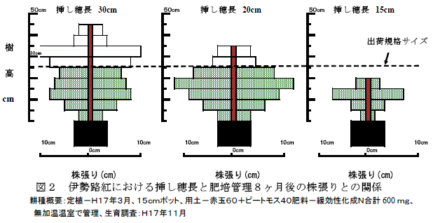 サツキ(伊勢シリーズ)は、8月に慣行の2倍長の挿し穂を、発根の優れるミストセル挿し法(セル成型挿し・ミスト管理)を用いて挿し木することで、3月鉢上げが可能となり、春期の生育が促進することで生育が6ヶ月間短縮され、15ヶ月間で規格サイズにできる。 | ||||||