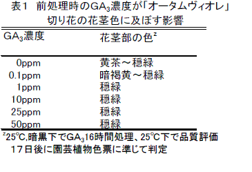 アリウム「オータムヴィオレ」の切り花に対して、10~25ppmのGA3を16時間前処理することで、花茎の黄変抑制と日持ちが延長する。 | ||||||