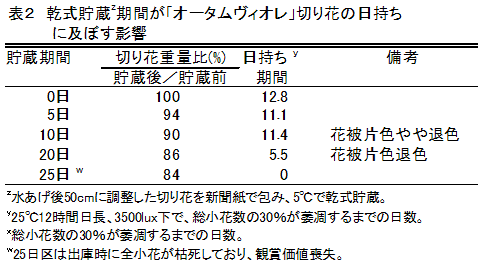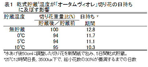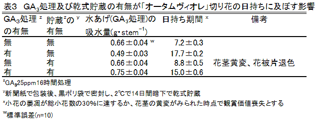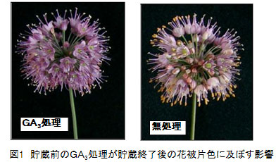 秋咲きアリウム「オータムヴィオレ」切り花は、0℃~5℃で10日間の乾式貯蔵が可能であり、貯蔵前の切り花にGA3を水あげ処理することで、貯蔵後の切り花の日持ちが延長され、花被片の退色も抑制される。 | ||||||||