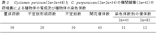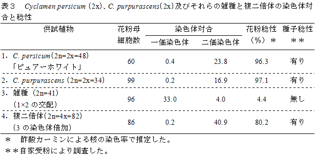 二倍体園芸品種(C. persicum 2n=2x=48)と二倍体野生種(C. purpurascens 2n=2x=34)の染色体対合では、二価染色体形成の平均値は高く、花粉、種子ともに稔性がある(表3)。 |