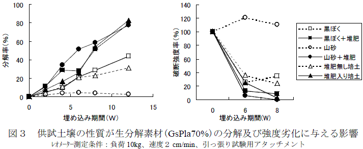 生分解ポットの側面を短冊状に切断した切片を用い、土壌水分、温度を一定にした培養器中に土壌埋設し、経時的に重量変化、破断強度、開口率を測定することで各素材の実用的特性が評価できる。 | ||||||