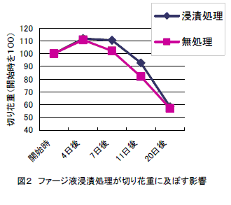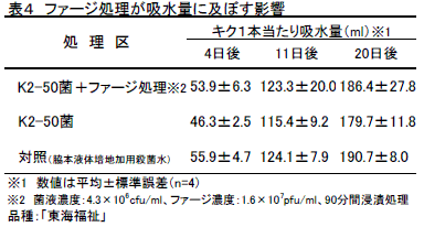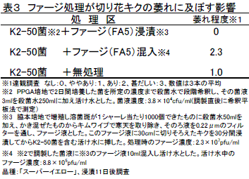 切り花キクの萎れや導管閉塞には数種類の細菌が関与しておりPantoea dispersa菌の影響が大きい。キク圃場から分離したこの菌に溶菌作用を示すファージを前処理剤的に高濃度で浸漬処理すると、萎れと切り花重の低下を抑制する。 | ||||||||||