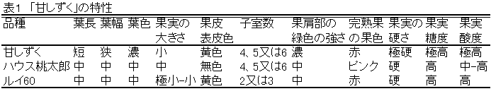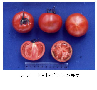 トマト新品種「甘しずく」は、特別な栽培法を用いることなく、通常の栽培法で糖度が高い果実の生産が可能な促成栽培用F1品種である。 |