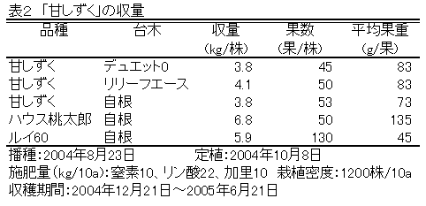 「甘しずく」の果実重は80g程度で、収量は「ハウス桃太郎」に比べて60~70%である(表2)。 |