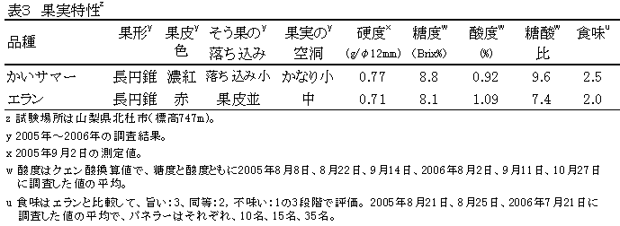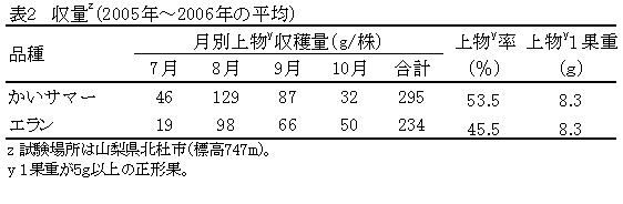 「かいサマー」は、「章姫」に「エラン」を交雑して育成した四季成り性イチゴ品種である。果実の形状や食味に優れ、盛夏期にも収量が落ち込むことなく7~10月に安定収穫可能で、山梨県の高冷地における夏秋どり栽培に適する。 | ||||||||||||||||