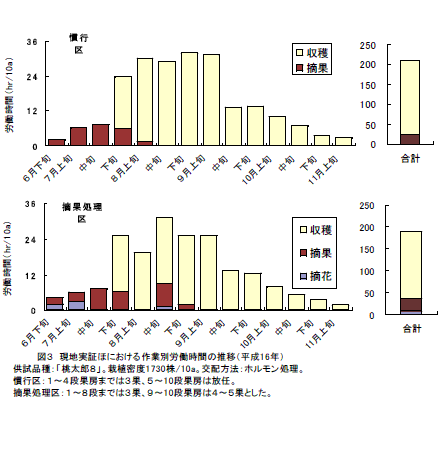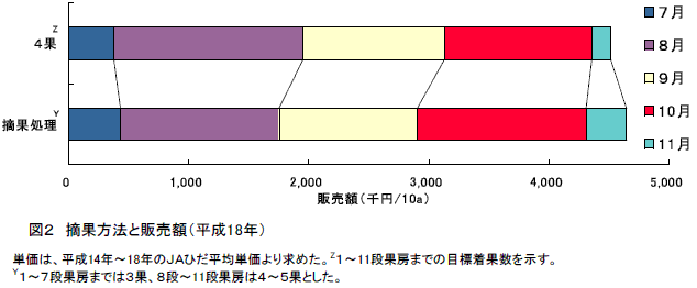 夏秋トマト栽培において初期・中期は3果、後期は4~5果に調整することによって、8月、9月に集中していた収穫労力のピークが10月以降に分散化され、かつ、果実単価上昇により収益性は向上する。 | ||||||||