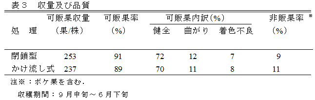 閉鎖型の環境保全型養液栽培において、促成ナスの養分吸収量を基に培養液処方を開発し、本処方の給液管理例を作成した。給液ECは定植~厳寒期が1.3dS/m、3月以降は1.0dS/mで管理することで慣行のかけ流し方式と同等の収量品質が得られる。 | ||||||||