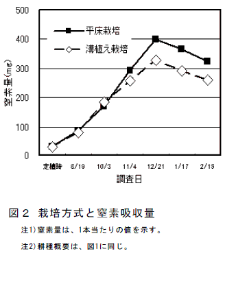 秋冬取り作型における根深ネギの平床挿し苗栽培は慣行溝植え栽培より、11月以降の窒素の吸収量が多く、収穫期の生育は優れる。また、根は畝上部に多く分布し、総根量も多い。 | ||||||