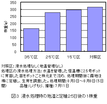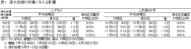 埼玉県内のブロッコリー産地における降雨被害要因としては、栽培ほ場の排水環境及び生育初期にあたる8~9月の多雨の影響が大きい。また、浸水時の生育ステージが小さいほど、浸水中の地温が高いほど影響が大きく、品種の耐湿性の強弱も影響し、生育遅延や減収を招く。 | ||||||