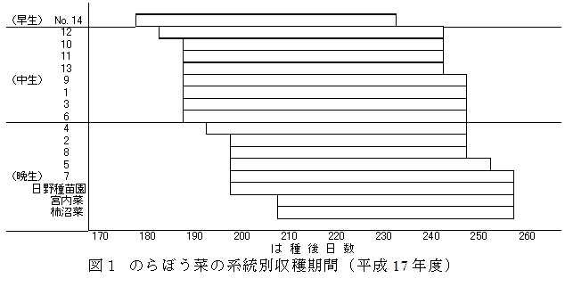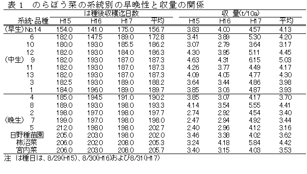 のらぼう菜川崎在来系統間には早晩性および収量に関する系統間差異が存在し、この系統を組み合わせて活用することにより、連続収穫体系の確立が可能である。 | ||||||||