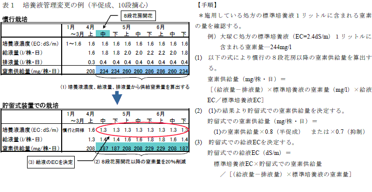 培養液の管理は、第8花房開花まではこれまでと同じEC値とし、それ以降は、収穫が開始され肥料成分の吸収がゆるやかになるため、施用窒素量をこれまでより半促成栽培では20%(表1)、抑制栽培では30%、少なくなるようにする。 |