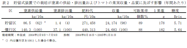 トマトの養液栽培では掛け流し式装置が主流だが、施用した肥料成分のうち植物に利用されなかった分は温室外に排出されるため、環境への影響が懸念されている。そこで既存の装置を改造して余剰窒素成分を温室外へ排出しない貯留式装置とし、それに適した培養液管理を明らかにする。
