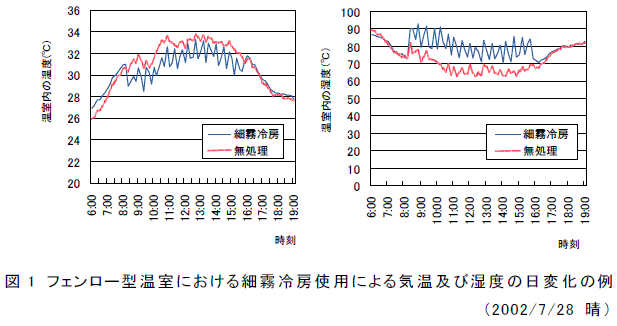 夏期高温期の晴天状況下において細霧冷房装置を利用することにより、フェンロー型温室で細霧冷房を使用しない場合と比較すると10分ごとの平均温度で最大2.5℃前後、高温抑制でき、相対湿度は80%程度に保つことができる(図1)。 |