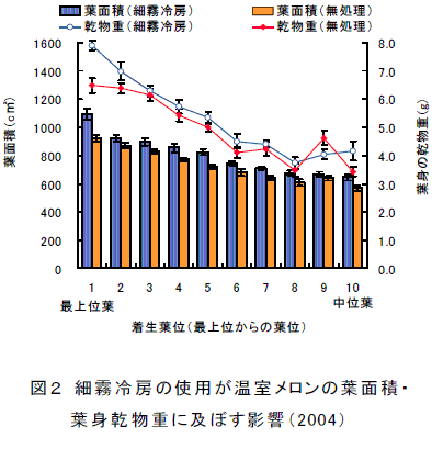 夏期にフェンロー型温室において、固定型の細霧冷房装置を使用することで、高温乾燥条件が改善され、温室メロンの草丈や葉の生育が促進される。これにより、ネットの盛りが向上したり、果重が増加したりする効果が得られ、スリークォータ型温室と同等の高品質な温室メロンが生産できる。 |