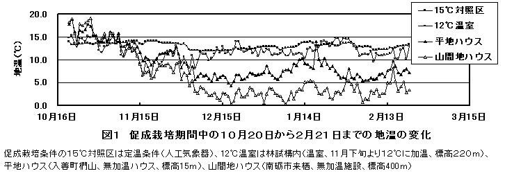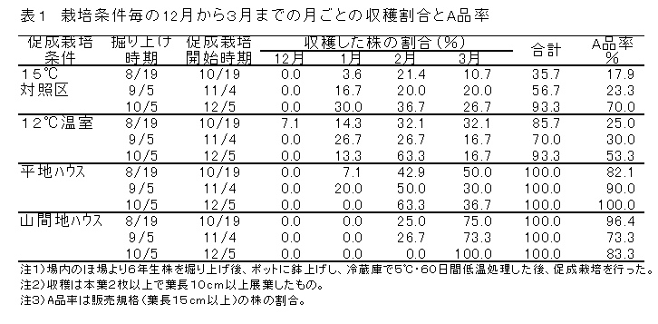 積雪地域でギョウジャニンニクの促成栽培を行う場合、10月上旬に掘り上げ5℃、60日間の低温処理後、標高の低い地域の無加温施設では地温5~10℃で推移すれば2月に収穫できる。標高の高い地域の施設内では地温が5℃以下で推移するので3月の収穫となる。 | ||||||