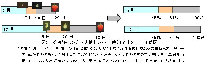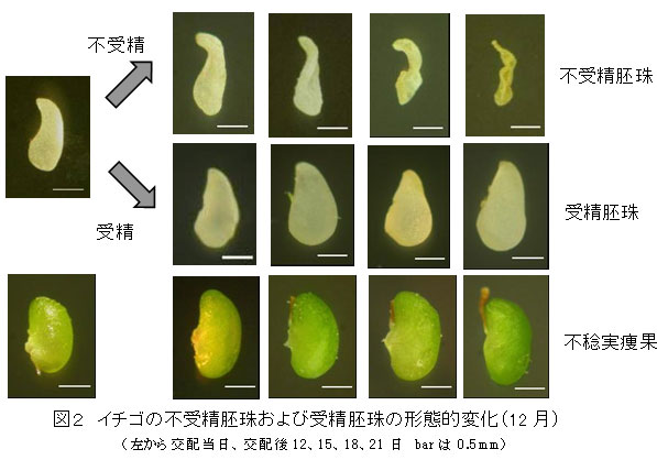 イチゴの受精胚および胚珠の形態変化は、痩果の外観からは予測できないが、胚や胚珠の発育は果実の成熟と連動しており、果実成熟必要日数に対する受精胚が最大となる日数および不受精胚珠が退化する日数の比率は一定である。 | ||||||