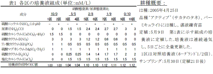 ホウレンソウを硝酸態窒素に富む培養液で栽培すると、硝酸塩が地上部に高濃度に蓄積する。一方、培養液の主な窒素源をアンモニア態窒素にすると、硝酸塩の地上部中濃度は顕著に低下するが、生育が著しく抑制される。養液栽培の窒素源として尿素態窒素も利用できるが、植物体内の代謝過程でウレアーゼが必要であり、その構造及び活性化にニッケル(以下Ni)が深く関係している。そこで、尿素態窒素比率が50%を越える培養液による栽培がホウレンソウの生育や地上部の硝酸塩濃度に及ぼす影響について明らかにする。 | ||||||||
