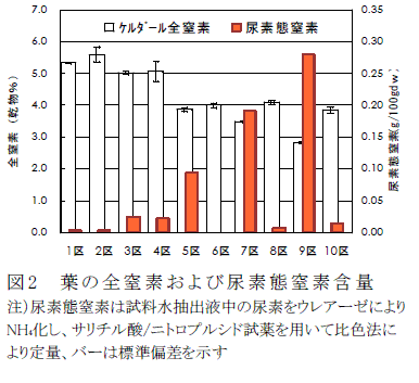 ホウレンソウの養液栽培で培養液の全窒素量の50%を尿素に置換すると、生育を維持したまま地上部中の硝酸塩濃度を約40%下げられる。さらに尿素比率を80%以上に高めると、ニッケル添加でやや改善されるが生育が抑制される。しかし硝酸塩濃度は著しく低下する。 | ||||||||