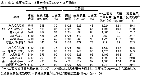 収量は「やぶきた」と比較して、煎茶では「みえうえじま」、「ふうしゅん」、「さやまかおり」、「さえみどり」が高く、かぶせ茶では「ふうしゅん」、「さやまかおり」、「みえうえじま」が高い。両茶種ともに、特に「ふうしゅん」、「みえうえじま」、「さやまかおり」の収量性と窒素吸収効率は高い(表1)。 |