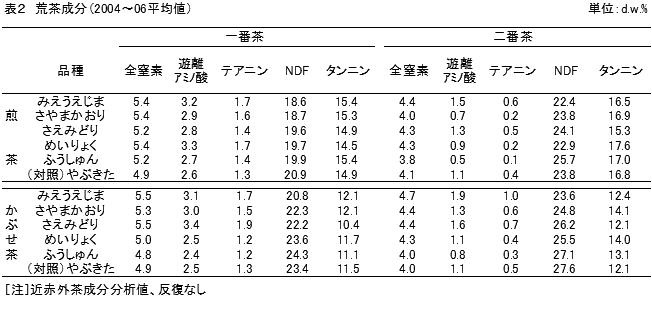 荒茶成分の全窒素、遊離アミノ酸、テアニン含有率は「やぶきた」と比較して、煎茶では「みえうえじま」、「さえみどり」が高く、かぶせ茶では「みえうえじま」、「さやまかり」、「さえみどり」が高い(表2)。 |