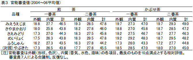 官能審査値は「やぶきた」と比較して、煎茶では「みえうえじま」、「さえみどり」、「さやまかおり」、「めいりょく」が同等以上であり、かぶせ茶では「みえうえじま」、「めいりょく」が同等以上である(表3)。 |