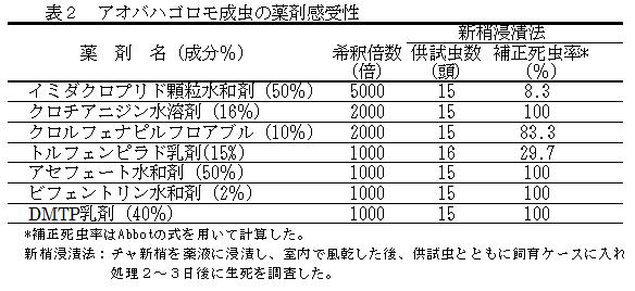アオバハゴロモの薬剤感受性は薬剤により大きく異なり、成虫、老齢幼虫ともにDMTP乳剤に高い感受性を示す。 | ||||||