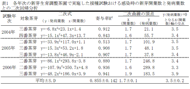 開葉数を基準としたチャ炭疽病に対する新芽の感受性程度を表すモデル式 | ||||||||