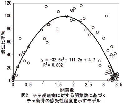 チャ炭疽病に対し、「やぶきた」成木茶園における新芽の開葉数が0~3.5葉までの発生比率はy=-32.6x2+111.2x+4.7( y:発生比率%、x:感染時の開葉数)で表すことができ、発生比率100%を示す最も感受性の高い生育ステージは1.7葉期頃である。 | ||||||||