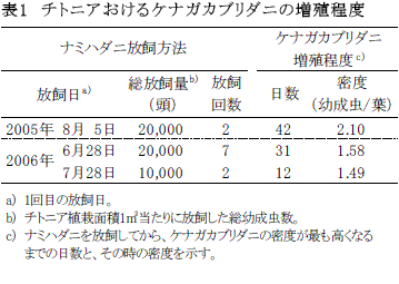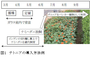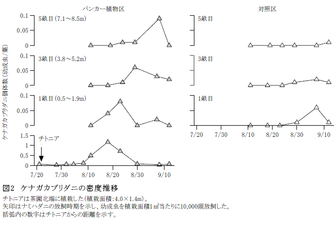 キク科のチトニアをバンカー植物に利用することで、チトニアで増殖したケナガカブリダニが茶園へ移動し、チトニアから8.5m離れた5畝目までチャのカンザワハダニの密度を抑制する。 | ||||||||