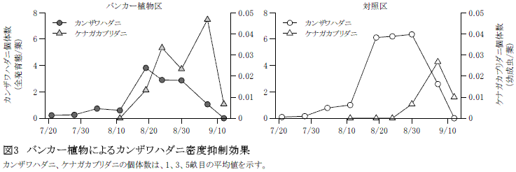 バンカー植物で増えたケナガカブリダニがカンザワハダニの密度を抑制する | ||||||||