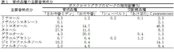 両育成品種にはC.purpurascensがもつ多様な香気成分が導入されており、甘さのある香気成分であるジヒドロファルネソールやファルネソールを豊富に含むことにより、甘い香りを保有している。他の主要香気成分との配合比により、「さわや香ミディ」は「柑橘系の果物とバラ」様の香気、「おだや香」は「甘いバラ」様の香気を発散する(表1)。 |