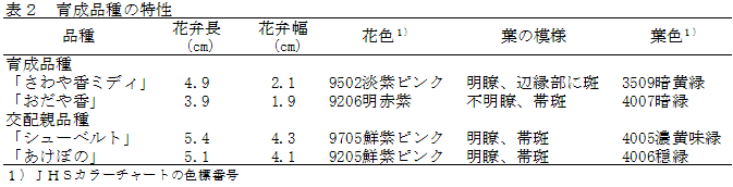 両育成品種とも中輪系で、花弁は細弁タイプである。花色は「さわや香ミディ」はピンク色、「おだや香」は赤紫色である。「さわや香ミディ」の葉では、辺縁部にのみハート型に斑が現れる(表2)。 |
