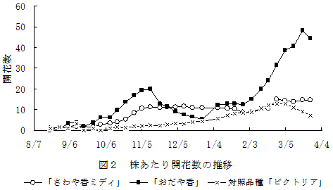 両育成品種とも従来品種よりも開花開始が早く、10月初旬に開花が認められる。開花期間も長い。「さわや香ミディ」では11月初旬から春まで開花数はほぼ一定数で推移する。「おだや香」は、11月に多く咲き、その後開花数は減少するが、2月以降再度増加し、その後、春まで開花数は増加し続ける。春は、従来品種と比較して開花数は多い(図2)。 |