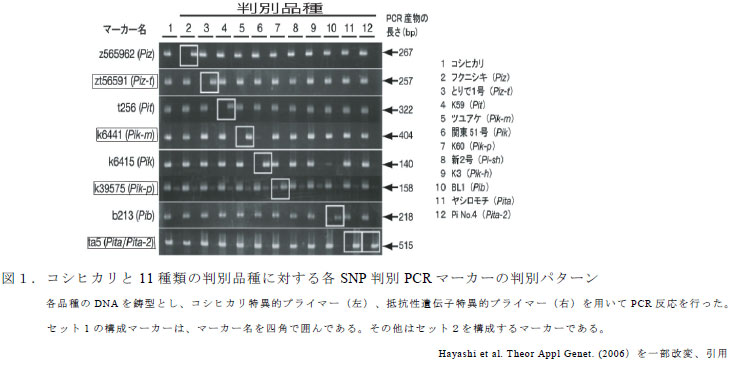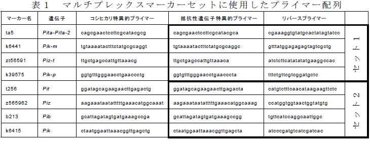 本DNAマーカーセットは、8種類のいもち病真性抵抗性遺伝子近傍に構築したSNP(一塩基多型)判別PCRマーカーを再構築、混合し、検出の効率化を図ったものである(表1、図1)。 |