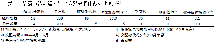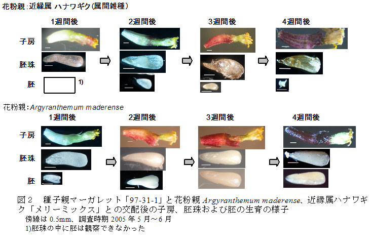 マーガレットとハナワギクとの属間雑種を効率的に得るには、交配約3週間後に子房から胚珠を摘出し培養する胚珠培養が適している。 | ||||||