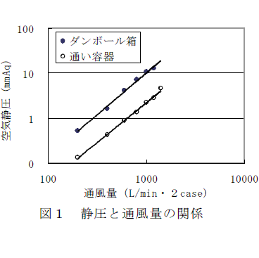 大風量の差圧通風予冷において、氷蓄熱高湿度冷蔵庫では直膨式冷蔵庫よりコカブの重量減少が小さく外観品質も良い。また、通い容器を用いるとダンボール箱と比べ1/5の静圧差で同じ冷却速度が得られる。 | ||||||||