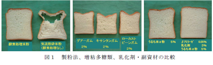 米粉に少量のグアーガム、乳化剤、βアミラーゼ剤を添加することを基本組成とし、イースト等の一般的な製パン材料を加えることにより、グルテンを用いずに嗜好性の高い米粉パンが製造できる。 | ||||||||||