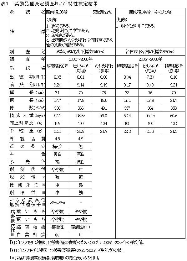 「越南糯196号」は福井県農業試験場において、「越南糯144号」を母、「ふくひびき」を父として交配され、系統育種法により育成された系統である。 |