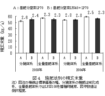 早期播種による「コシヒカリ」の乾田直播栽培(壌質土)では、苗立ち数を100本/m2程度とし、肥効調節型肥料LPS40、LP70及びLPSS100を2:1:2の比率(窒素成分量6kg/10a)で混合し、播種溝へ種子と同時施用することにより、倒伏を軽減しながら慣行移植並みの収量が得られる。 | ||||||||