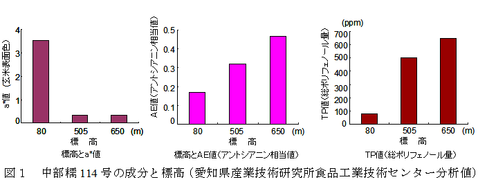 「中部糯114号」は温暖地東部では早生の晩に属し、「朝紫」より多収の紫黒糯系統である。中山間部においてアントシアニン含量が高く、品質も良好となるため、中山間部の特産米として、また、新開発の赤色みりん醸造用としての用途が期待される。 | ||||||||||||